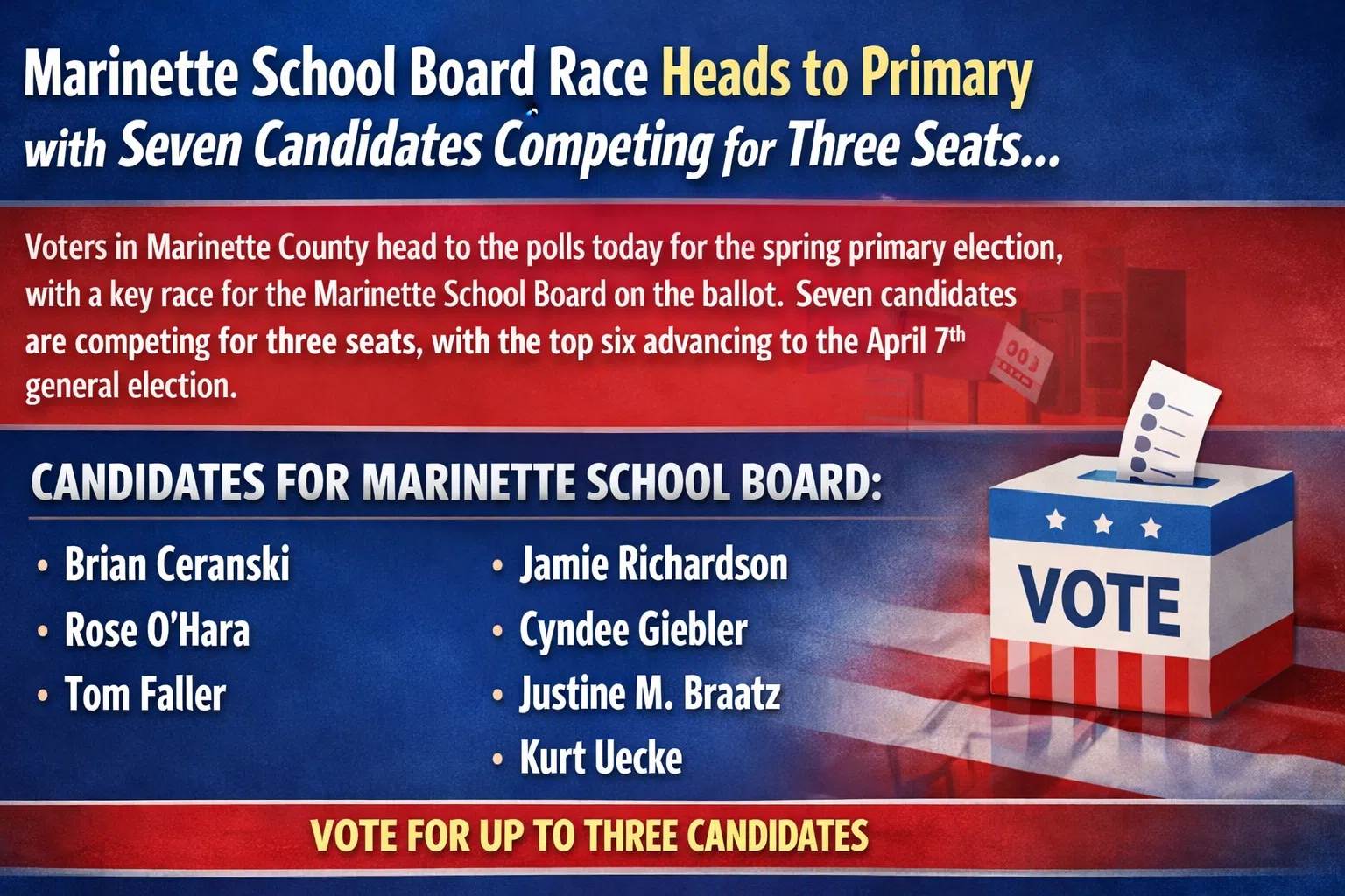 MARINETTE SCHOOL RACE HEADS TO PRIMARY WITH SEVEN CANDIDATES COMPETING FOR THREE SEATS