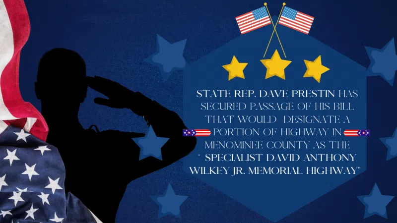 STATE REP. DAVE PRESTIN HAS SECURED PASSAGE OF HIS BILL THAT WOULD DESIGNATE A PORTION OF HIGHWAY IN MENOMINEE COUNTY AS THE "SPECIALIST DAVID ANTHONY WILKEY JR. MEMORIAL HIGHWAY"